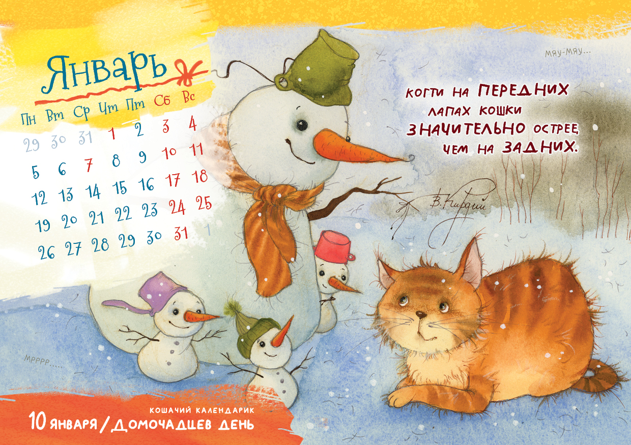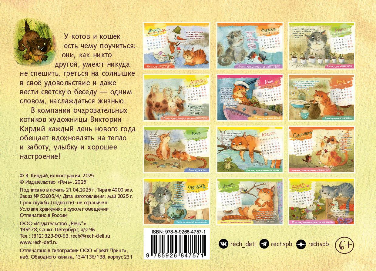 У котов и кошек есть чему поучиться: они, как никто другой, умеют никуда не спешить, греться на солнышке в своё удовольствие и даже вести светскую беседу - одним словом, наслаждаться жизнью. В компании очаровательных котиков художницы Виктории Кирдий каждый день нового года обещает вдохновлять на тепло и заботу, улыбку и хорошее настроение! Календарь-домик украсит дом, офис или рабочий кабинет. Его удобно разместить на столе или на тумбочке. Календарь сделан из качественных материалов, он будет радовать вас весь год и станет прекрасным подарком для близких, друзей и коллег! |