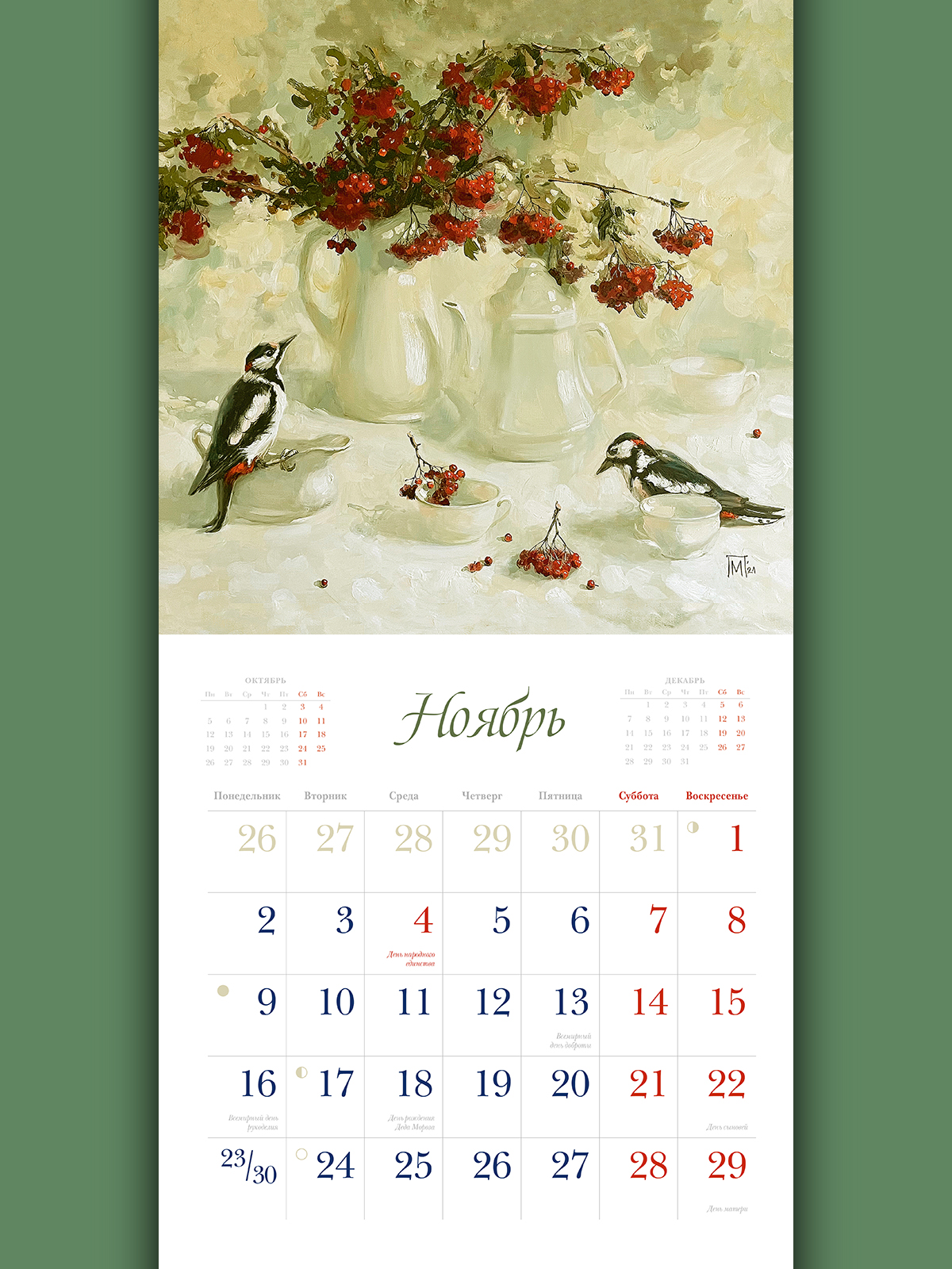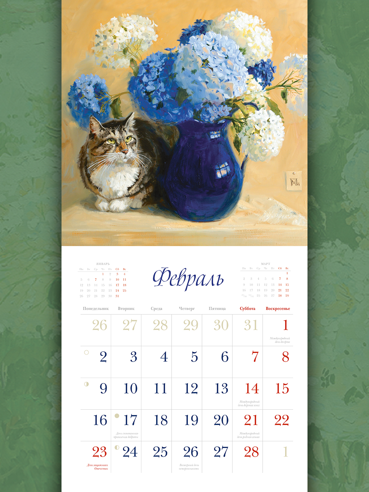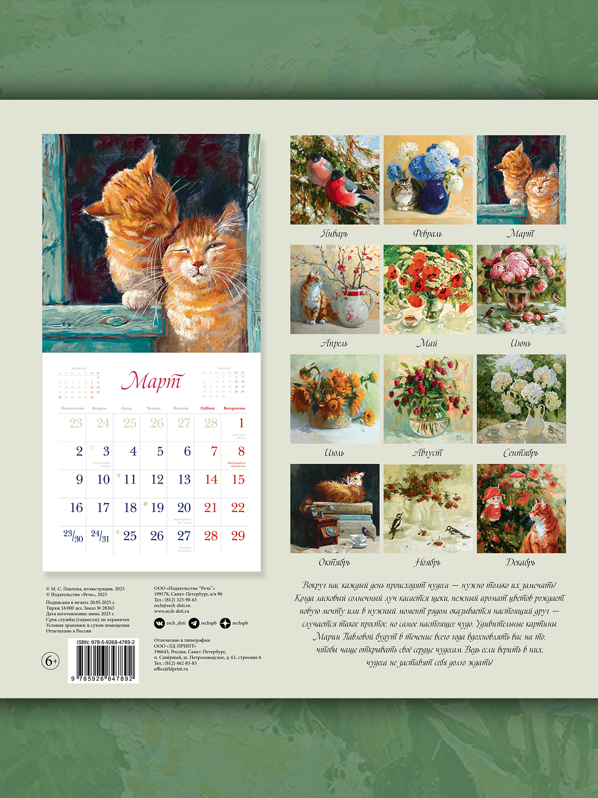 | Вокруг нас каждый день происходят чудеса - нужно только их замечать! Когда ласковый солнечный луч касается щеки, нежный аромат цветов рождает новую мечту или в нужный момент рядом оказывается настоящий друг - случается такое простое, но самое настоящее чудо. Удивительные картины Марии Павловой будут в течение всего года вдохновлять вас на то, чтобы чаще открывать свое сердце чудесам. Ведь если верить в них, чудеса не заставят себя долго ждать! |