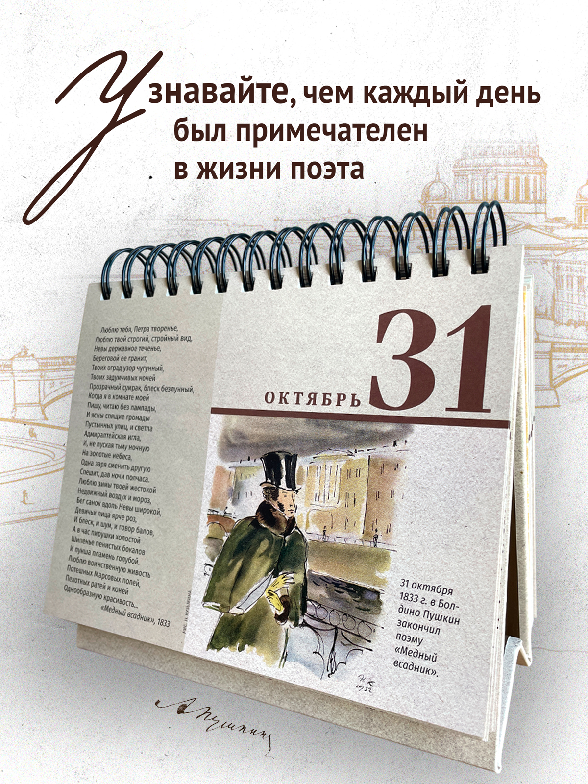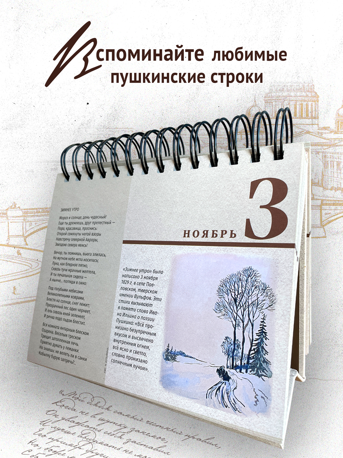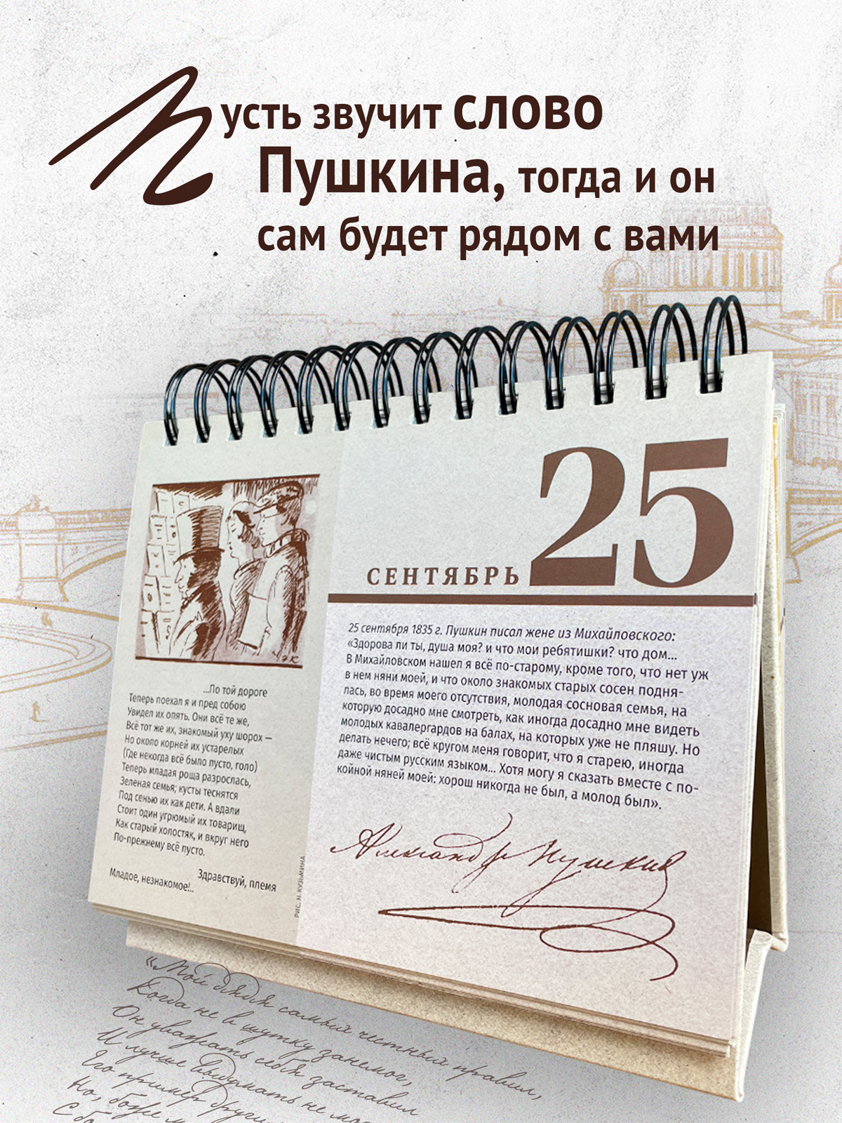 Предлагаем Вам, читатель, прожить год вместе с Александром Сергеевичем. Поставьте на стол наш календарь и за утренней чашкой кофе или чая узнавайте, чем этот день был примечателен в жизни поэта, вспоминайте строки, знакомые с детства, и открывайте для себя те, что, возможно, Вы еще не читали. Пусть звучит слово Пушкина — тогда и он сам будет рядом с Вами. Он умел смеяться и плакать — значит, в любой день он надежный спутник. Вас будут сопровождать рисунки поэта, а также рисунки Николая Кузьмина и Татьяны Мавриной. Эти художники относились к Пушкину не как к бронзовому классику, а как к живому человеку. Однажды их прочную семью метко назвали «любовным треугольником»: третьим был Пушкин. |