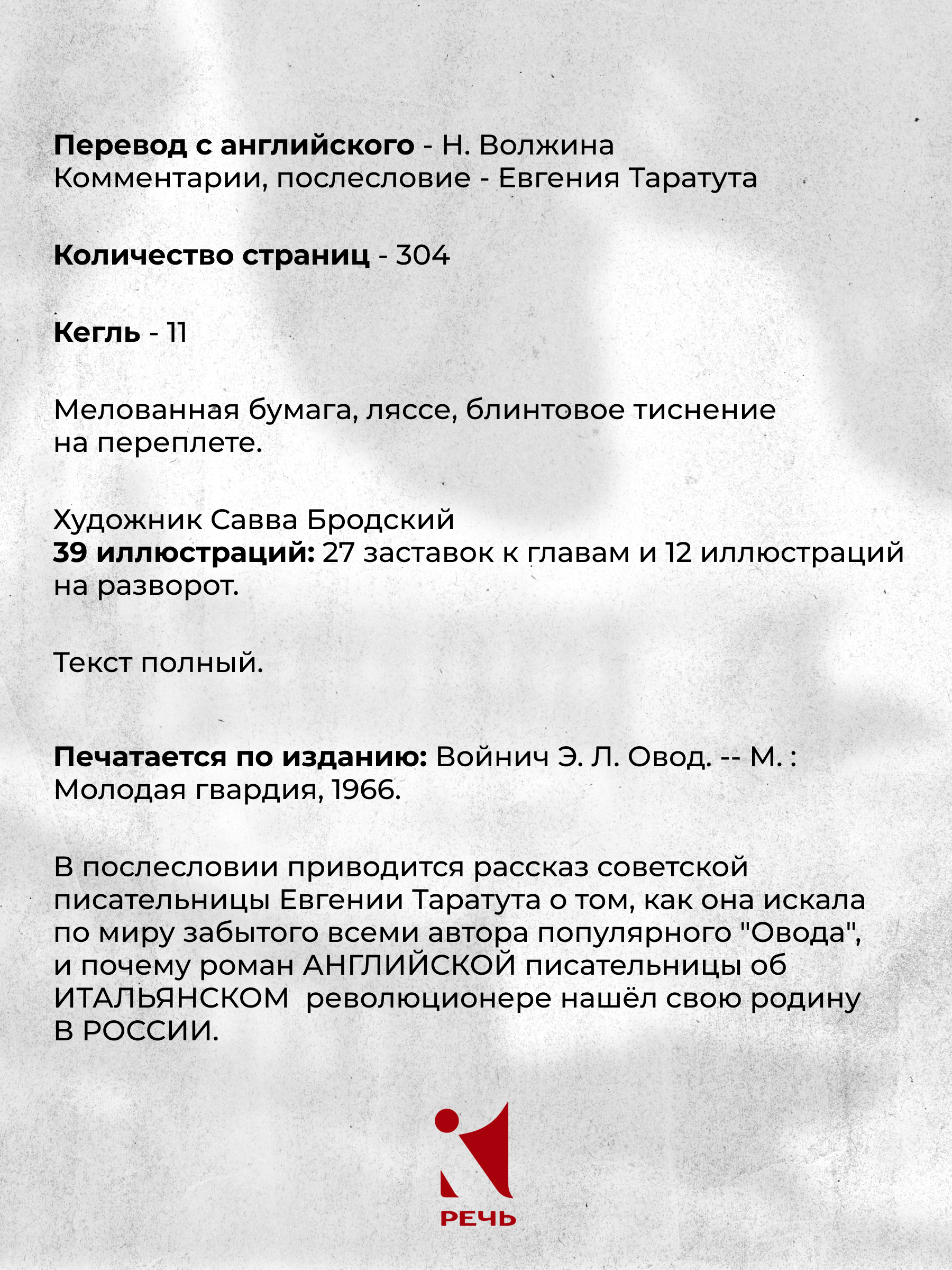 Роман «Овод» английской писательницы Этель Лилиан Войнич впервые был опубликован в июне 1897 г. в Нью-Йорке; два месяца спустя он вышел в Лондоне, а ещё через полгода — в России, при этом перевод на русский язык стал первым. Книга сразу же приобрела популярность: на миллионы читателей она производила впечатление, неизгладимое ни годами, ни другими впечатлениями. Между тем о самом авторе было мало что известно; у себя на родине Э. Л. Войнич была забыта, не знали даже, жива ли она. В начале 1950-х годов советская писательница и литературовед Евгения Таратута задалась целью найти автора любимого романа: для неё отважный Овод, до последнего вздоха сохранявший верность своим убеждениям, тоже был спутником жизни, опорой и поддержкой в тяжёлые дни. Искала долго — и нашла! Забытая всеми писательница жила в Нью-Йорке в маленькой квартире на семнадцатом этаже унылого серого дома, ей шёл 92-й год. Таким образом на закате дней Э. Л. Войнич узнала о своей мировой славе, неведомой ей до тех пор… В ходе поисков удалось установить, почему произведение английской писательницы об итальянском революционере нашло свою родину в России (фрагмент книги Е. Таратута «По следам „Овода“» приводится в настоящем издании). В 1966 г., в преддверии юбилея Октябрьской революции, роман «Овод» вышел подарочным изданием с иллюстрациями Саввы Бродского. На белом переплете, в самом низу, знак-символ: след пули и струйки крови, «проступающей» на форзаце. «„Овод“ — проза, в которой накал подлинных страстей причудливо сочетается с салонностью, — рассказывал художник. — Я старался избежать этого. В заставках давал фон событий, пейзажи Калабрии, архитектурную среду. А в разворотах изображал основные конфликты в их резкой динамике, подчёркивая суровый душевный мир главного героя, заостряя внимание читателя на убеждениях Овода, а не на сентиментальной истории его любви к Джемме». |