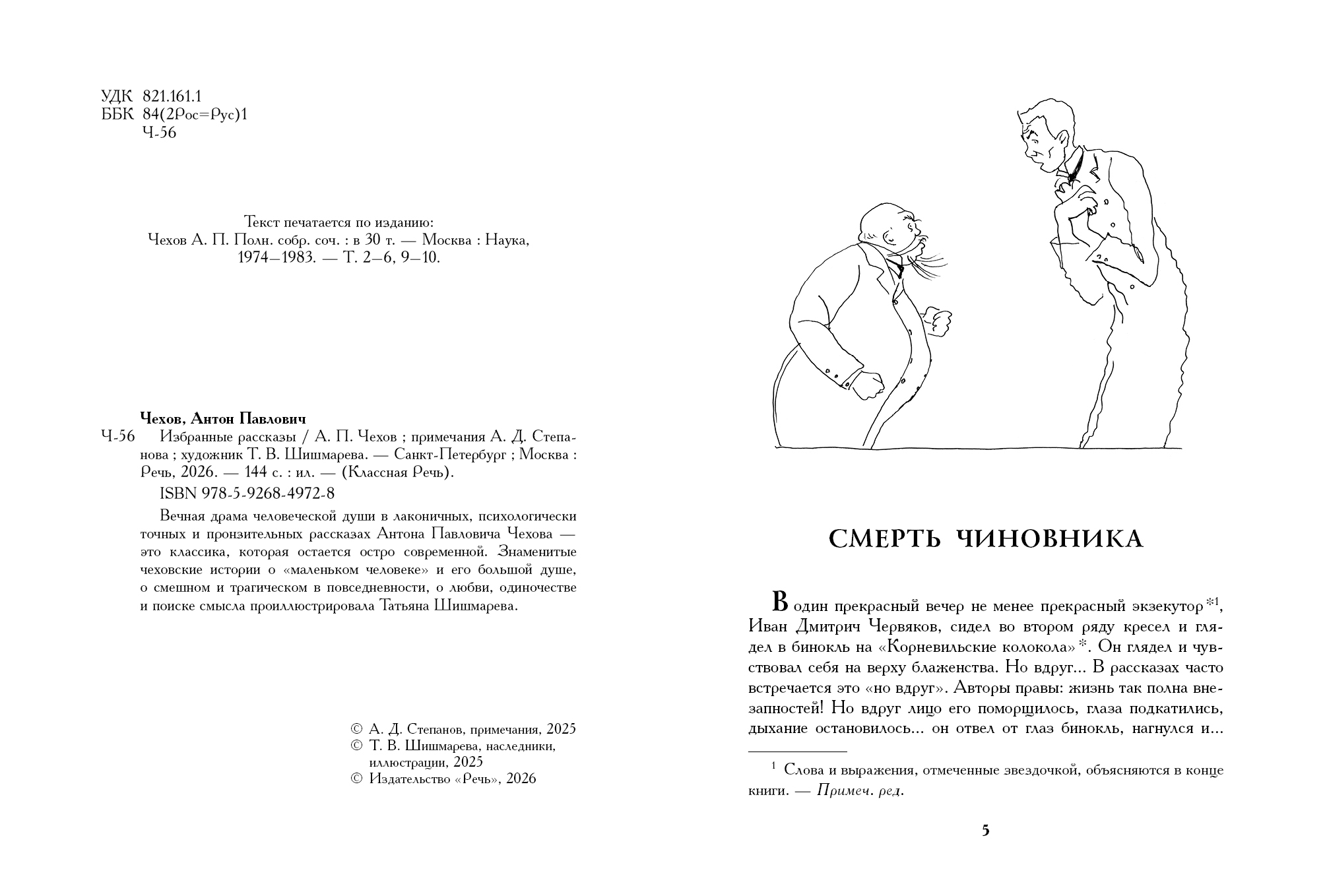 | Вечная драма человеческой души в лаконичных, психологически точных и пронзительных рассказах Антона Павловича Чехова — это классика, которая остается остро современной. Знаменитые чеховские истории о «маленьком человеке» и его большой душе, о смешном и трагическом в повседневности, о любви, одиночестве и поиске смысла проиллюстрировала Татьяна Шишмарева. |